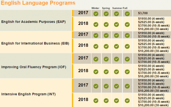 프로그램 | International Education Programs English Language Programs Intensive English Program (INT) 집중 영어 프로그램 (Intensive English Program : INT)은 1 년 내내 운영되며 대학이나 대학 진학을 목표로하는 학생들을 위해 디자인되었습니다. 100 (시작)부터 700 (고급)까지 7 단계의 풀 타임 이머젼 형식 프로그램입니다. 입학 레벨을 결정하기 위해 평가 테스트를 치르게됩니다. 각 레벨은 10 주 (특별 초강력 여름 8 주 세션 제외)이며 통합 교과 과정을 포함합니다. 레벨을 성공적으로 완료하면 다음 단계로 넘어갈 수 있습니다. 목표에 도달 할 때까지 원하는만큼의 세션을 유지하십시오. 더 오래 머무르면 더 많은 혜택을 누릴 수 있습니다.